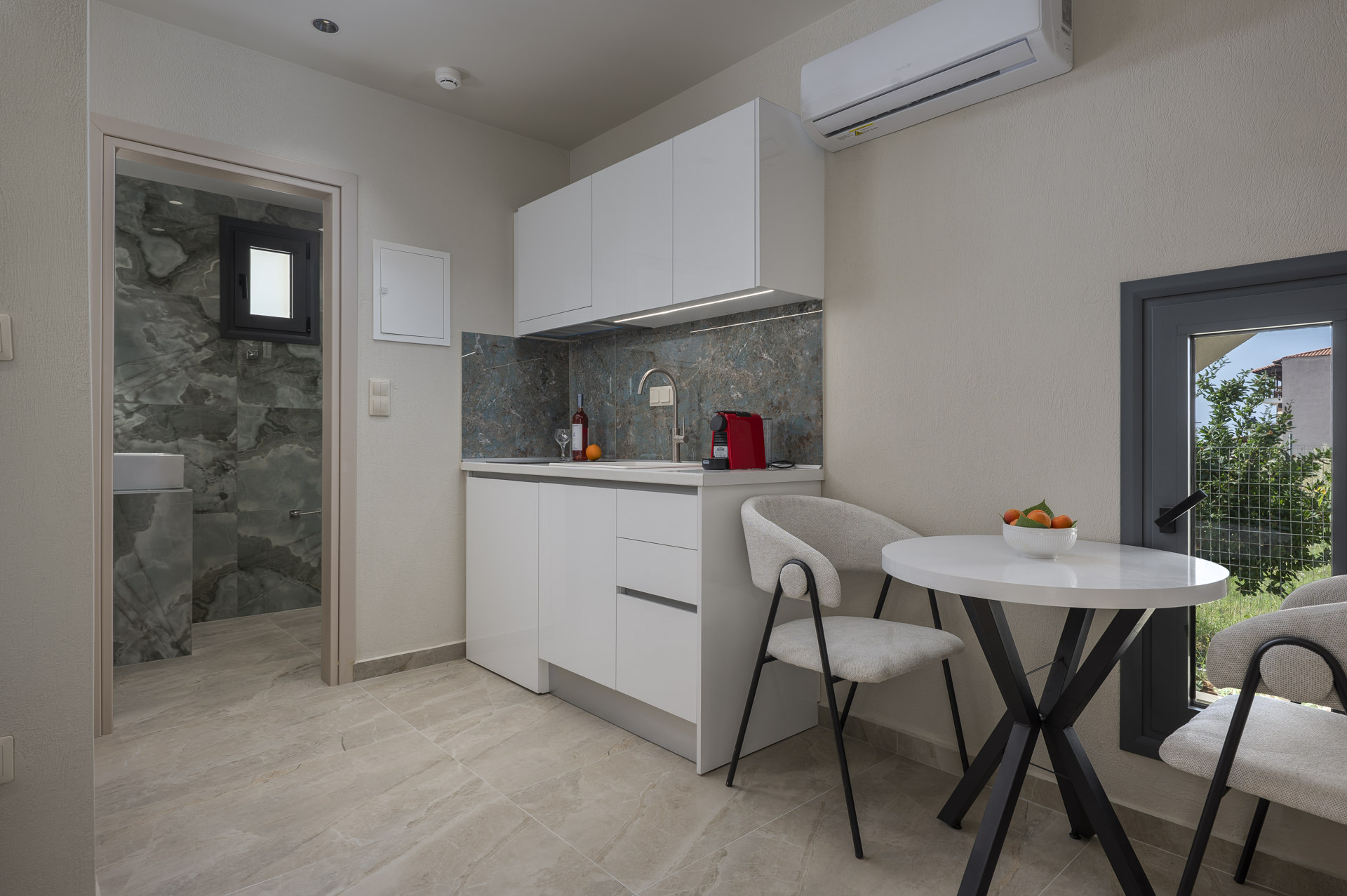 Discover Villa Vanesa’s Two-Bedroom Village-View Apartment, nestled just steps from Nea Flogita’s sandy shore in Chalkidiki. Enter through your private entrance into a bright, air-conditioned living room that opens onto a fully equipped kitchenette—complete with stovetop, refrigerator, and tea & coffee maker—ideal for light meals and morning espresso before your day begins.